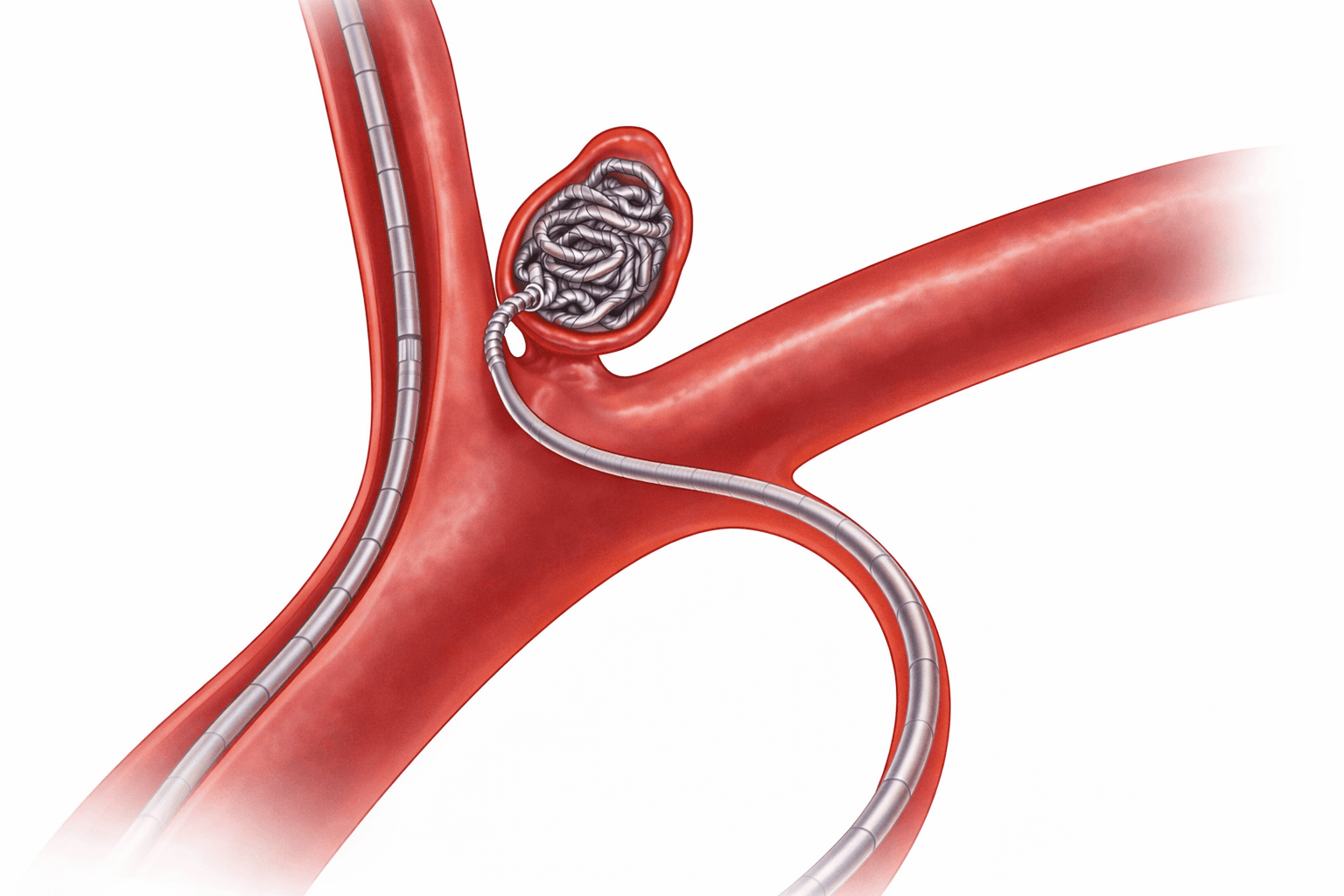 Metod prvog prvog izbora. manje invazivan (nema otvaranja glave). Nekad se upotrebljavaju stentovi gde je potrebna primena dvojne antiagregacione terapije.